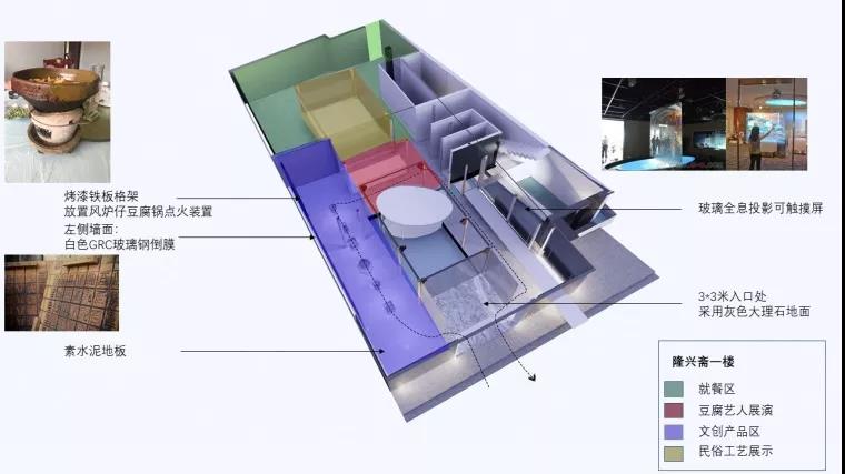 为此,团队对风炉仔TOFU博物馆空间进行整体性策划设计:TOFU博物馆展陈方面前区作为街区与餐厅的过渡与连接部分,中堂保持当地建筑特色,水池丰富景观(四水归堂),以一小道出入豆腐工坊,两边实墙,空间“欲扬先抑”,“壶中天地”聚气,仪式感强。