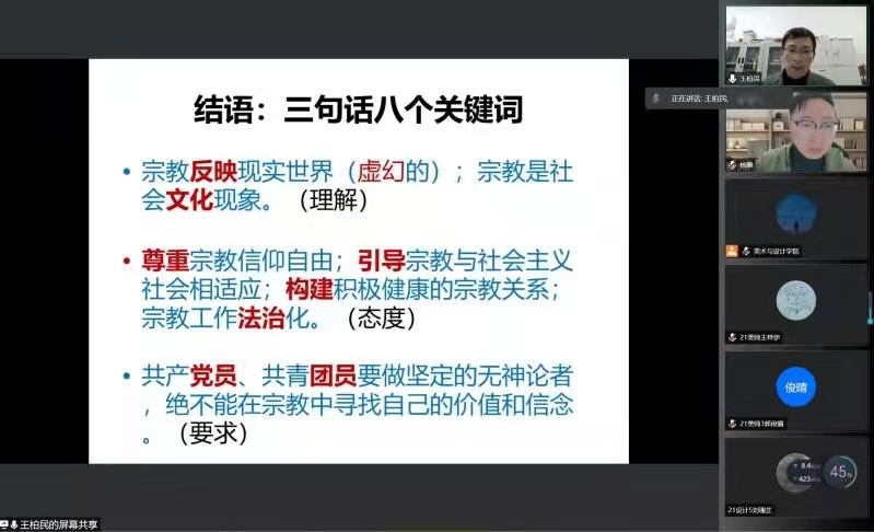2021年12月22日晚18点,漫画柜 2021级形势与政策报告会在疫情防控的要求下于线上举行。本次会议的由漫画柜 学工办主任杨鹏老师主持,并特邀了马克思主义学院党委书记王柏民老师、漫画柜 纪委副书记杨立淮老师以及漫画柜 学生共计两百余人。本次会议旨在通过线上讲座的形式,为广大学生解读马克思主义宗教观以及构建网络安全生态环境下对大数据时代的思考,进行反诈防诈教育,建设和谐安全的校园。