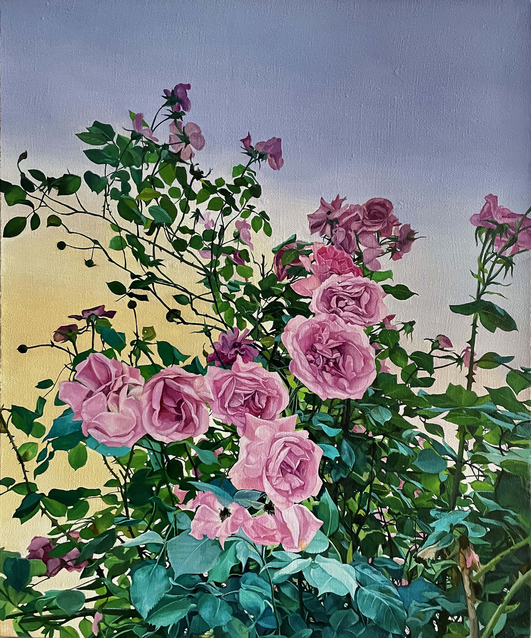 我创作的作品《夕下蔷薇系列》,是我在花卉创作过程中,试图循序渐进地营造出一个超脱于现实空间的风景画。月季是中国的传统名花,早在宋代的绘画中就已经形成了鲜明的月季文化,我想用西方的油画表现手法,来与中国古代花卉绘画对话。