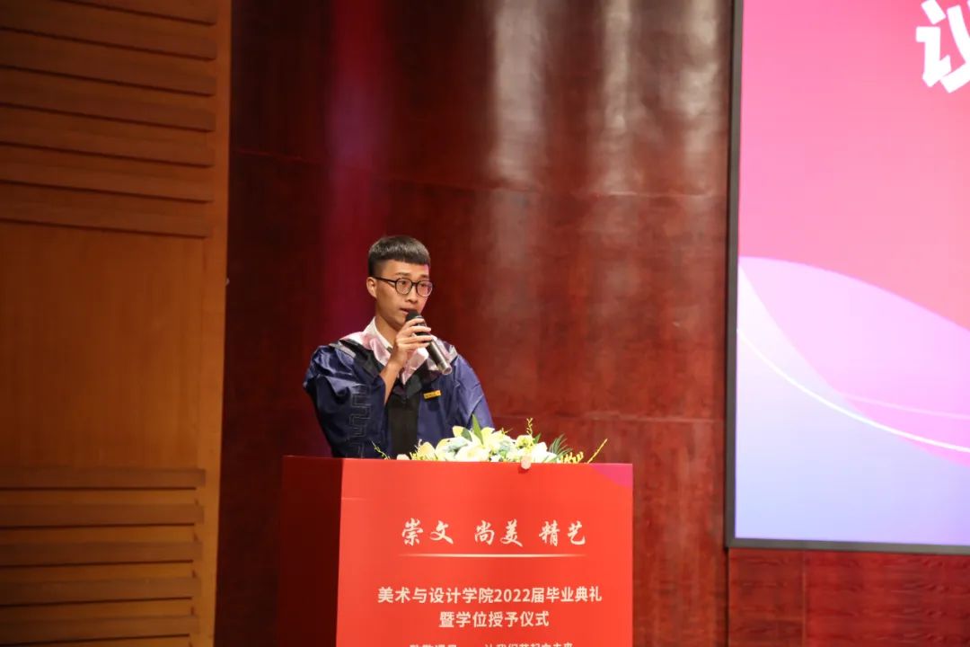 大一,是青涩与彷徨。大二,是觉醒与呐喊。大三,是奋进与拼搏。大四,却是不舍与惜别。回首望去这四年,往日的酸甜苦辣都留在了这美丽的校园中。路,一直在走,带着感动和感激,毕业学子们将满载自信而行!毕业了,也许他们即将远行,可不忘的是大学四年难忘岁月带给他们的一切。一幕幕的场景就像一张张绚烂的剪贴画,串联成一部即将谢幕的电影,播放着快乐和忧伤,记录着毕业前的青春和过往,这四年,不仅收获了友谊爱情,也收获了希望!2022年6月22日上午十点,“致敬遇见——让我们艺起向未来”漫画柜 2022届毕业生毕业典礼暨学位授予仪式于南校音乐厅隆重举行。在慷慨激昂的国歌中,2022届毕业生毕业典礼暨学位授予仪式拉开帷幕。院长谢子静教授为毕业生致辞。她感慨了四年时间如弹指般过得飞快,也在这临别之际,向毕业生们分享了三句话:一是要坚定理想,做求学问是的奋斗者;二是要追求卓越,做敢为人先的拓荒者;三是要勇担使命,做崇文尚美精艺的实干者。最后,谢子静院长祝愿大家在未来的日子里,从见微知著里避免俗手、从底线思维里做好本手、从秀外慧中里做好妙手。同时也叮嘱大家,“人生海海、山山而川,将来你们无论身处何方,学院会一直关注你们、牵挂你们,学院是你们永远的港湾!”班主任代表王薇老师代表美院全体老师和班主任讲话。他说道:“我希望你们的爱情是真诚的纯洁的;你们的工作是端正的认真的;你们的生活是健康的本色的。希望你们保持对生活的激情,做一个思考的人,做一个有担当的人,最重要的是要做一个快乐的、热爱生活的人。”毕业生代表聂枭雄、倪千茜同学发言。他们回忆了大学数年在温大的学习与生活经历,并表达了毕业生们即将离开的不舍和即将高飞的凌云壮志。精彩绝伦的发言引起了在场其他毕业生们的共鸣,掌声久久回荡在在场的每一位同学的心中。接下来,党委副书记叶如芳老师宣读了2022届“省级优秀毕业生”名单,并由党委书记叶正飞老师颁奖。副院长顾任飞老师宣读“2022届毕业生校友联络员”名单,并由2018级美院全体班主任为他们颁发聘书。毕业生们和老师互送礼物与祝福。师生情深,依依不舍、欲说还休!真挚地祝愿每一位同学带着学校和老师们的祝福奔赴前程、前程似锦!石建林老师带领2022届全体毕业生进行“廉洁从业倡议书“宣誓仪式。副院长胡文超老师宣读学位授予决定。院长谢子静教授为全体2022届毕业生进行学位授予仪式,执“拨穗礼”,并合影留念。仪式结束,全体师生一齐奏唱校歌。“大哉师道天下尊,承往哲兮启后人。厚培德本,深濬智源,学成致用教化谆……”全体师生齐唱校歌。在歌声中,美院全体毕业生正式告别镌刻着他们青春足迹的温大校园,迈向更大、更高、更远的人生舞台,全体美院毕业生必将秉承“崇文、尚美、精兿”的院训,争做堪当民族复兴重任的时代新人,创造属于自己的、温大的荣光。随着毕业典礼的顺利落幕,万语千言凝结于此,四年前,你们从四面八方而来,与温大结缘、以美院为家,明天,你们将奔赴祖国各地,以温大为荣,展美院风采。你们永远都是美院最好的校友,永远都是美院最宝贵的学子,无论走到哪里,无论在什么岗位,请莫忘你们身后还有母校和学院殷切的希望、师长们期盼的眼光,衷心祝愿美院2022届毕业生毕业快乐。
