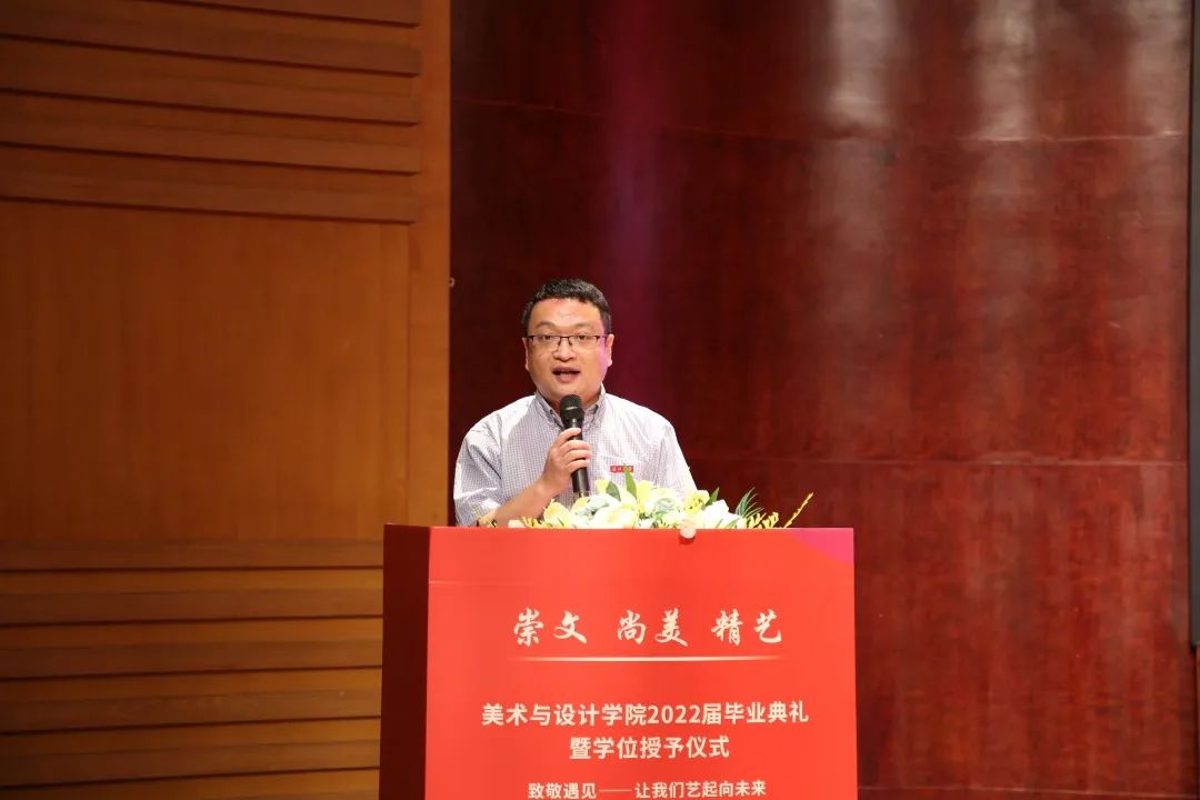 班主任代表王薇老师代表美院全体老师和班主任讲话。他说道:“我希望你们的爱情是真诚的纯洁的;你们的工作是端正的认真的;你们的生活是健康的本色的。希望你们保持对生活的激情,做一个思考的人,做一个有担当的人,最重要的是要做一个快乐的、热爱生活的人。”