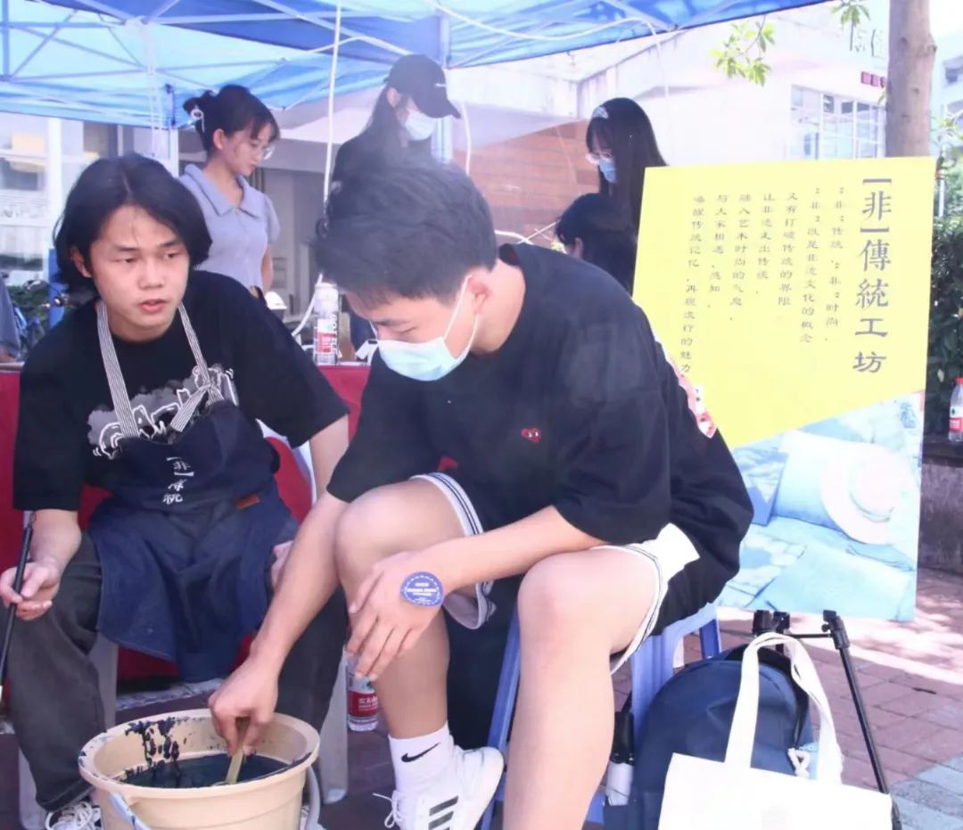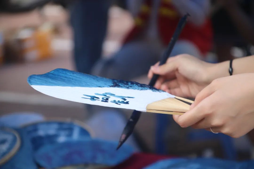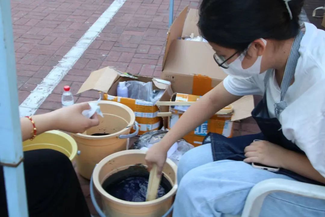 在报到处,学院邀请了“非传统工坊”,结合学院的专业特色,带领新生体验非遗传统蓝染文化。以扇子为载体,让非遗走出传统,走进学生生活,融入艺术的时尚气息,唤醒传统的记忆,再现流行的魅力!希望新生可以在体会非遗文化美丽的同时,也感受到我们美院特有的美育气息。