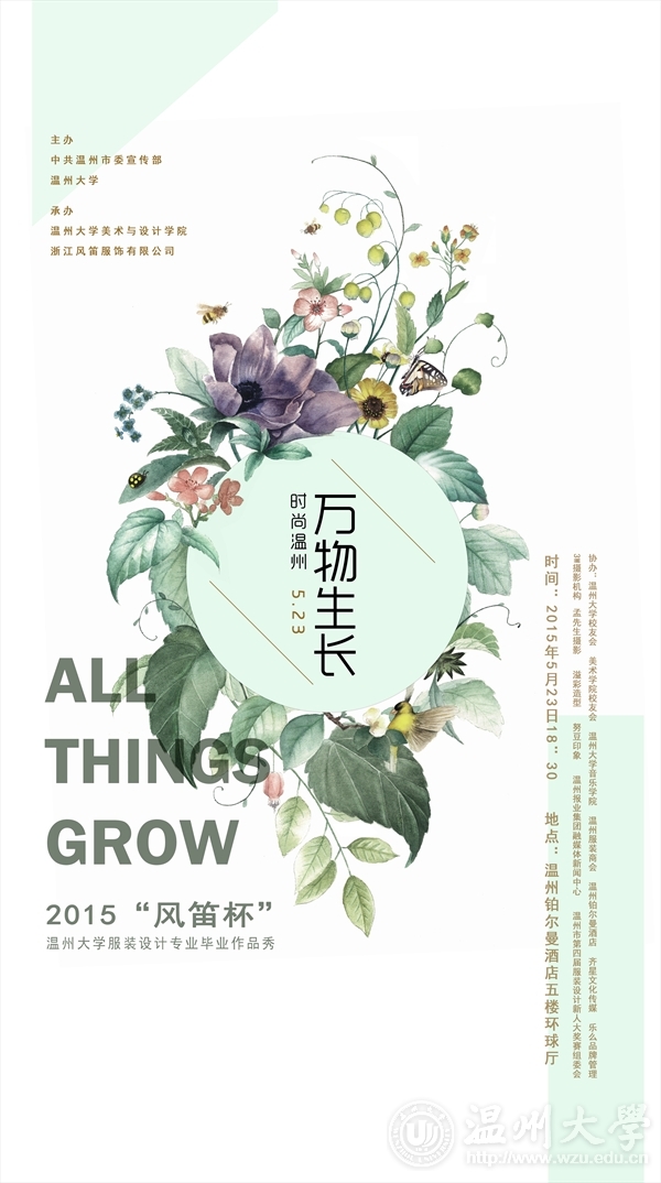 活动主题:时尚温州·万物生长活动时间:2015年5月23日(周六)晚18:30活动地点:温州铂尔曼酒店主要内容:来自国外的时装模特与国内高级时装模特联袂演绎美院2015届毕业生原创优秀作品,邀请国际国内服装设计以及相关领域的专家、学者、商家、企业家9人组成评委会,对现场新生代设计师的风格自述以及时装发布会进行综合测评,产生金银铜优秀奖等多个奖项。温州乃至中国时尚界、艺术界、文化届名人名流等参加,国内一流的场地设施、舞美灯光及音响效果。旨在为温州服装界推选新人的同时,加强温州时尚界产业范畴的沟通与交流,整体凸显温州时尚产业的潮流、个性与形象。 热忱欢迎全校师生莅临观摩指导! 漫画柜 2015年5月21日