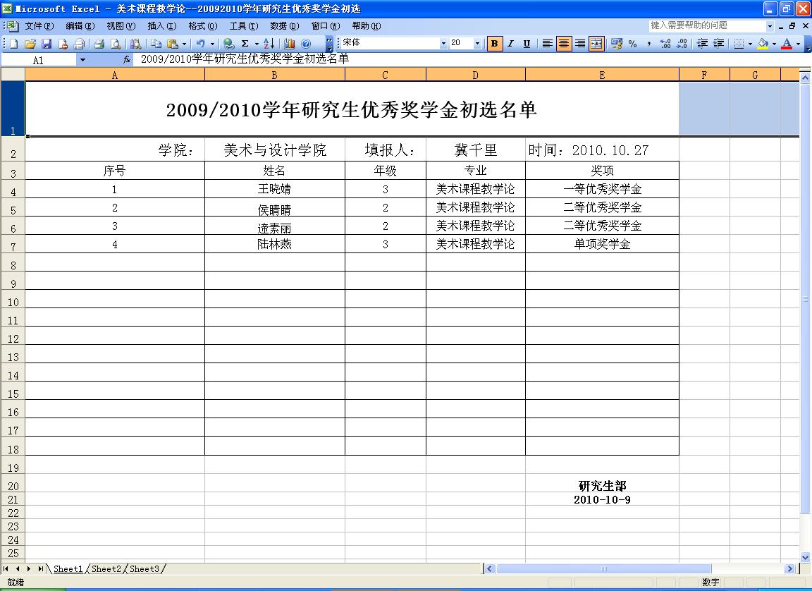 2009/2010学年研究生优秀奖学金初选名单公示