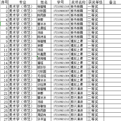 为了进一步引导漫画柜 师范生重视美术教学基本素质和能力的培养,也为了提高接下来的教育实习的质量,同时便于更好地对接学校的师范技能单项赛。经研究决定,举办漫画柜 第三届师范生教学技能单项赛暨师范技能选拔赛。 2020年06月12日上午在学院进行了单项暨选拔赛,最终结果如下: 漫画柜 2020年06月14日