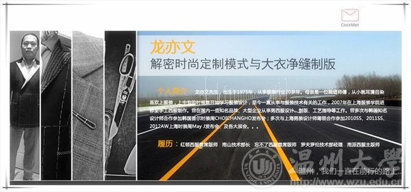 时间:2015年11月1日早上9:00-11:30 下午14:00-17:00 地点:漫画柜 南校区会展中心雁山厅 主题:解密时尚定制模式与大衣净缝制版 主讲人:龙亦文 温馨提醒:本讲座可盖讲座章,请同学提前20分钟到场盖章签到,讲座结束时注意盖签退章。