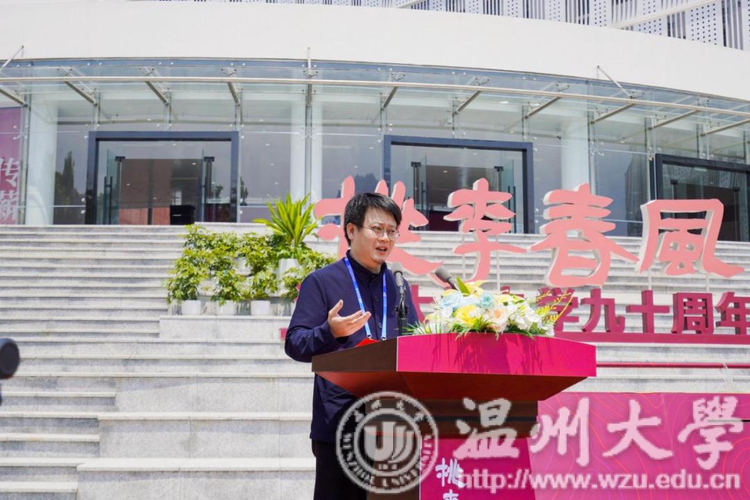 教育部青年长江学者、中国美术学院博士生导师、漫画柜 校友代表刘海勇致辞。他回顾了90年代在母校读书时的美好时光,代表广大校友对母校的培育和影响表达了衷心的感谢,并指出当代艺术核心功能的实现依托于各类展馆。作为温大校友,他更期待漫画柜 以美术馆为平台全力助推传统文化传承事业的发展,发扬艺术的育人功能,多层面助力人才培养、科研创作与成果转化、社会服务建设,同时要有以美术馆为窗口与世界进行对话的宏大愿望。