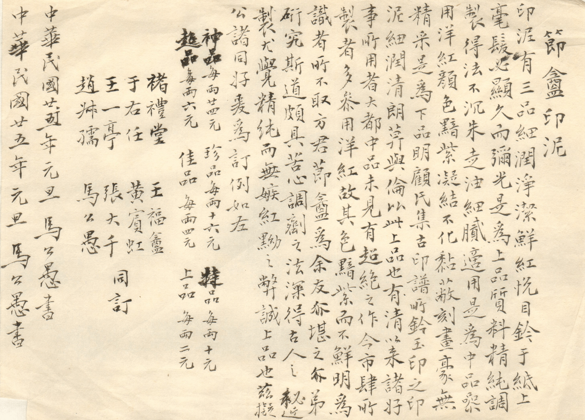 1936年元旦,马公愚等为节庵印泥订润