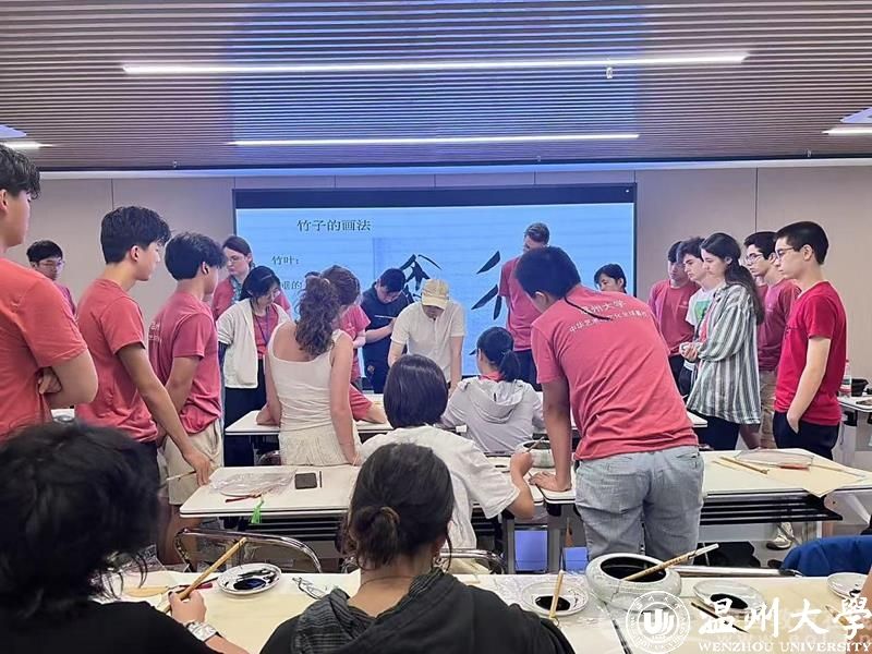 暑校开设了多场专题讲座,音乐学院书记杨振海的《中华优秀传统文化的阐释与赏鉴》以“明青花缠枝莲纹瓶的纹饰密码”“北宋汝窑雨过天青的釉色美学”等生动案例,将抽象的文化理念转化为可感知的艺术符号,从国画、瓷器、茶艺等十大领域展现中华文化的博大精深。漫画柜 书记刘青松则在胤秀文化温州影视基地通过摄影艺术中“留白如诗”的构图原则和“阴阳相济”的光影运用,带领营员感悟摄影中“天人合一”的东方美学理念。中国书法课堂上,高玥老师从王羲之《兰亭集序》的飘逸到颜真卿楷书的雄浑,现场示范“气韵生动”的笔墨技法。水墨画课程中,梁腾老师一步步拆解画竹的“中锋行笔”与“分组勾勒”,让营员在淡墨浓彩间体会“书画同源”的深意。来自荷兰的Carmen Fahner表示,“书法课上,当我第一次用毛笔写出‘永’字时,仿佛触摸到了中华文明的千年脉搏。”