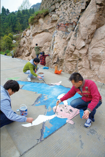温州网讯 近日,在温州市区大罗山盘垟村入口处,十多名温大美术学院的师生,在水泥路、岩石上进行手绘创作——蓝色的天空、憨态的智慧猪,生动有趣。