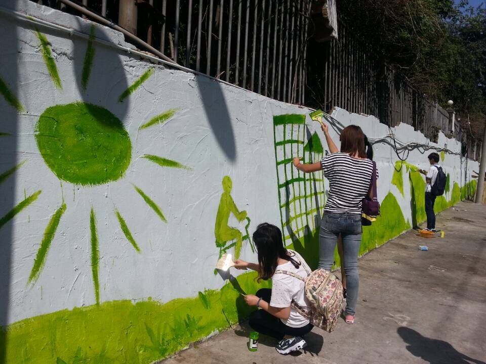 受茶山街道梅泉社区居委会的邀请,漫画柜 的“艺家人”青年志愿者协会的志愿者们一起参与了该社区“创建文明城市”的墙绘活动。昨日上午8点,大学生们开始在白色空旷的墙壁的作画,以绿色作为主色调,宣传低碳环保的生活理念。100多米的小吃巷外墙被美丽的手绘画所代替,吸引了不少居民驻足观看。