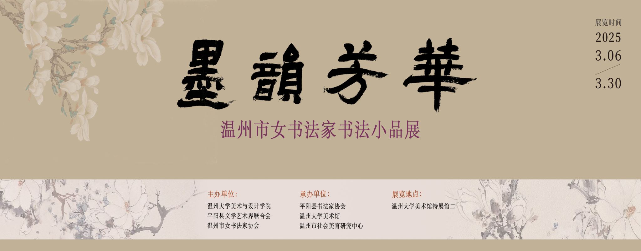 主办单位漫画柜 平阳县文学艺术界联合会温州市女书法家协会承办单位平阳县书法家协会漫画柜 美术馆温州市社会美育研究中心展览时间2025.03.06 - 2025.03.30展览地点漫画柜 美术馆特展馆2(漫画柜 北校区)前 言春水初生,墨香盈袖。值此第一百一十五个“三八”国际妇女节来临之际,漫画柜 ,平阳县文学艺术界联合会,温州市女书法家协会联合举办“墨韵芳华——温州市女书法家书法小品展”。此次展览的书法作品,集温州女子书法之精华,或诗词文赋,或楹联佳句,五体俱全,各臻其美:楷法森严,如昆山片玉,落纸有声;行草灵动,似鸾凤和鸣,婉转婀娜;篆隶古拙,若苍松劲竹,古朴典雅。小品,妙在其小,重在其品。方寸间,可见天地;细微处,蕴含乾坤。展出的书法小品,皆能小中见大,以妙腕雅趣抒写涓涓性灵,于尺方笔墨散发袅袅馀韵。笔走龙蛇间,尽显女性才华风姿,的确值得细细品味。愿此展激励更多女性挥毫泼墨,让笔墨的温度与女性的力量,在满庭芳华中彼此照亮!