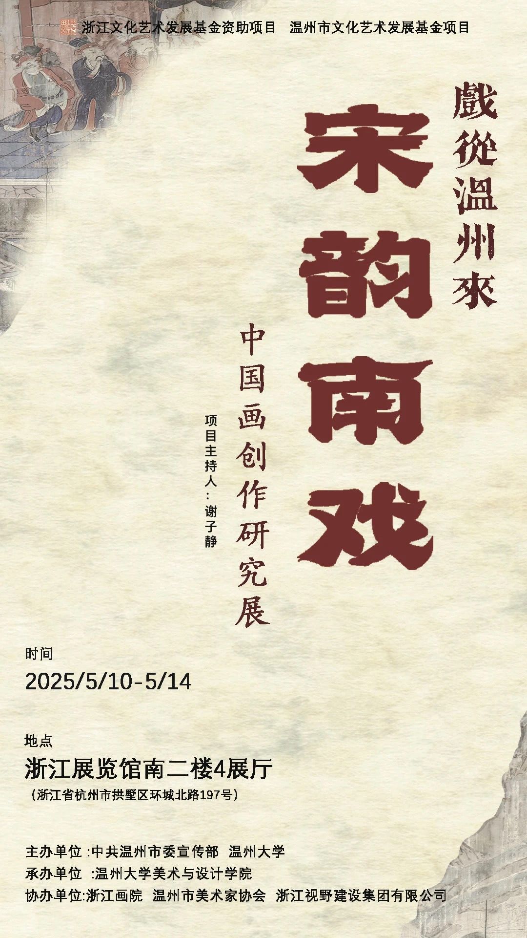 2025年5月10日,由中共温州市委宣传部、漫画柜 主办,漫画柜 承办的“戏从温州来:宋韵南戏——中国画创作研究展”在浙江展览馆隆重启幕。本次展览作为浙江文化艺术发展基金资助项目和温州文化艺术发展基金项目,汇聚了浙江各地70余位艺术家的80余幅作品,近代画家关良先生的20件戏曲画作品,以及温大师生团队创作的系列戏曲文创作品。本次展览分别从传承、演变、发展、转化和回眸等角度,探索了中国画与南戏这一中国戏曲源头的跨艺术形式融合。展览期间,省、市相关部门领导莅临巡馆,对展览在展示、传播等方面取得的成效给予充分肯定,对展览画册等成果高度认可。