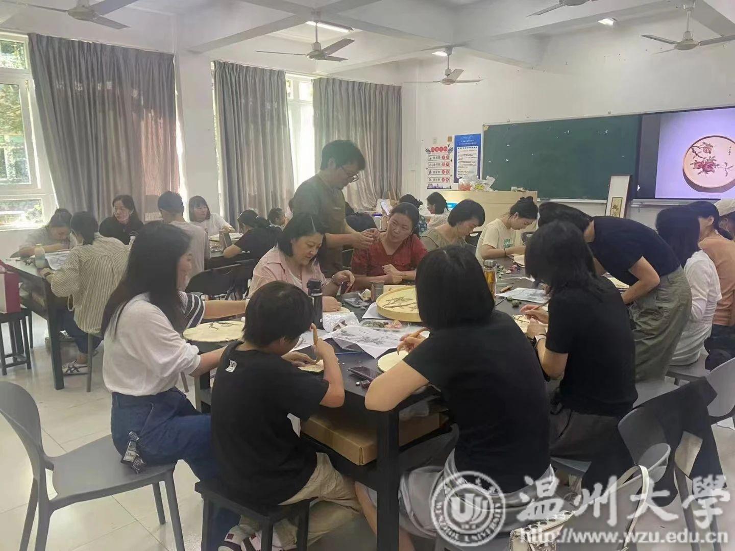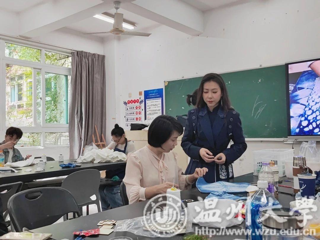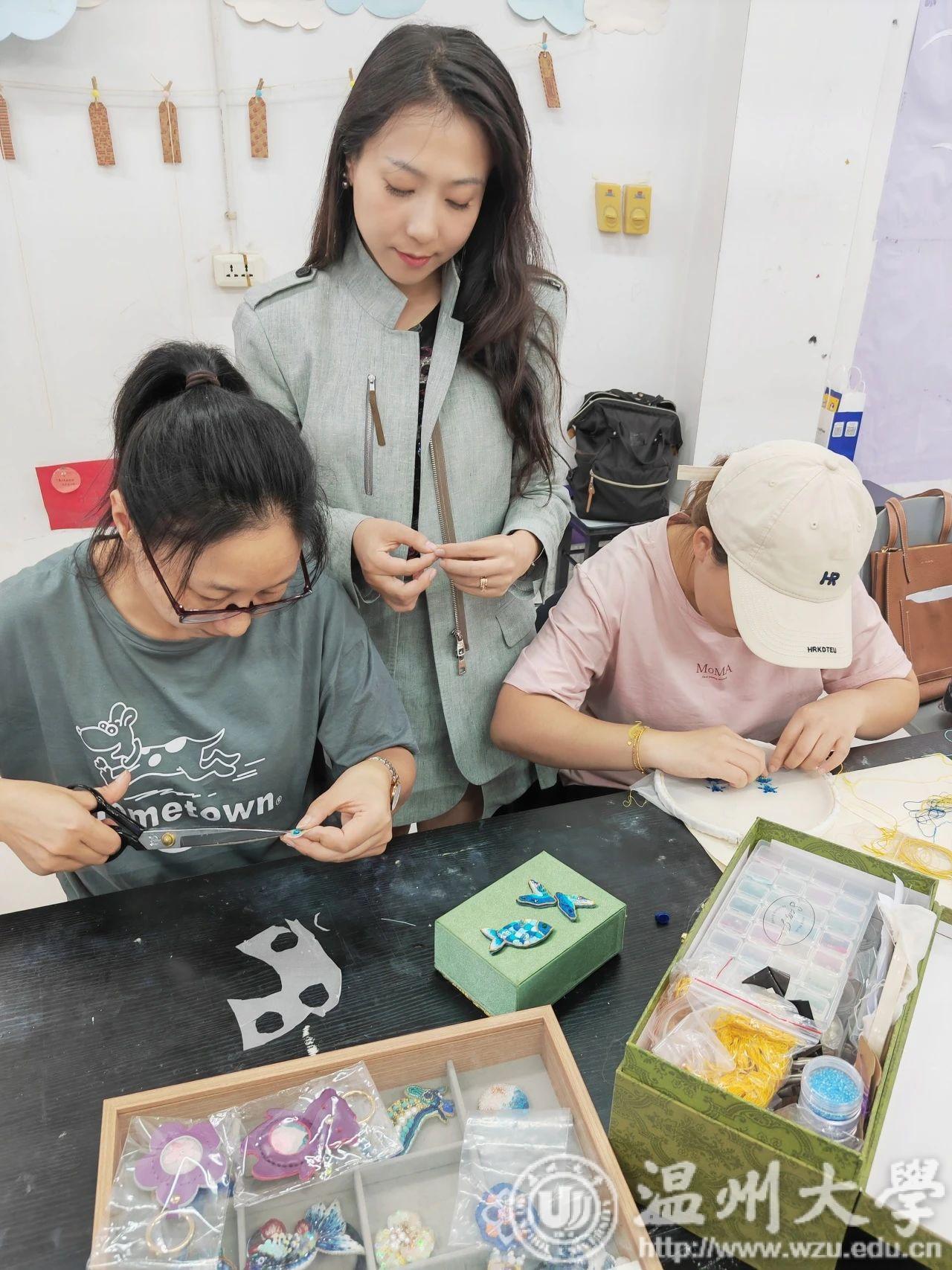 瓯绣是国家级非遗技艺,图案秀丽、色彩丰富、绣功精细、针法多变。温州市瓯绣非遗传承人余琼老师进阶性从起针,分线,绷布,描画,多种针法步骤进行讲授,并带领学员进行瓯绣小品创作。金晨怡教授在刺绣造物课程中传授刺绣技法、饰品与文创设计、非遗微课开发等内容。“通过这次学习借着刺绣,来一场与传承手艺的对话。我更熟练地掌握了瓯绣绣法。相信今后,一定能够绣出更好的作品。”有学员曾说过。