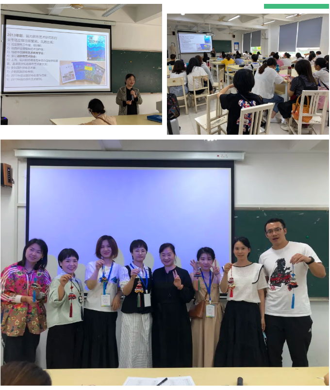 由陈明艳教授负责的《“爱拼”手工布艺设计》培训课,于2020年10月3日顺利开班,学员比计划数增加一半,坐无虚席。 首先,针对中小学生艺术素养的提升,陈明艳教授介绍了布艺设计美术教育的重要性;其次阐述了古今中外拼布艺术概况及其现实意义等,通过各时期拼布收藏品和精美的拼布艺术品图欣赏,展开图文并茂的讲解。下午,陈明艳教授讲授了YOYO拼布创意设计,亲手教学员缝制Y0Y0圣诞树和零钱包制作,学员们愉悦地体验Y0Y0布艺D|Y的快乐! 许丽慧老师讲授刺子绣,并为学员示范操作,学员们根据各自喜好的图案制作了刺子绣杯垫。 马俊淑老师讲授教堂之窗拼布,是利用折纸法结合斜纹布的伸缩性制作法。立体的效果、靓丽的配色,带来不同的美感;并讲授口金包的历史、种类、制作方法等。 最后一天,陈明艳教授将讲授布贴画,是不需针线缝的布艺装饰画制作法,注重花色布的搭配设计,且操作简便、装饰效果佳。 短短的5天培训课,学员们享受手作之乐,收获满满!让我们看看教学现场以及参加培训的老师们“日夜奋战”做出漂亮的布艺作品吧! 老师教学篇 学生作品 师生集体照 本次培训将有助于学员们进一步理解教师提升教学能力的重要意义、学习了新的教学技能与思路。今后,学员们也将把所学知识进一步应用到课堂教学中,为各个学校教学质量提升迈出重要的一步。