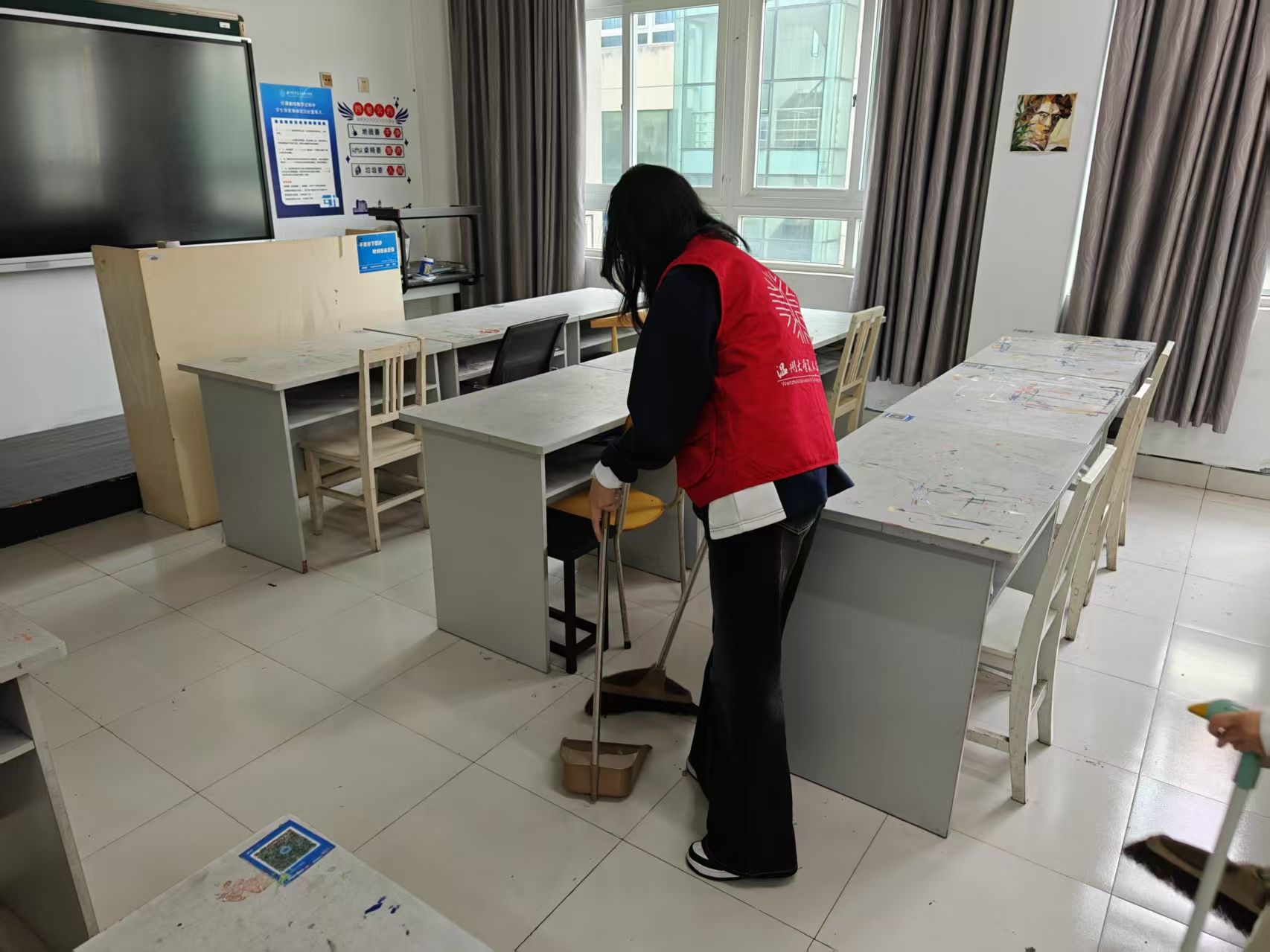 理论学习后,党员们迅速投身“劳动魅力亲身体悟”实践环节。20余名党员组成志愿服务队,对学院教学区域开展“地毯式”清洁行动:他们分组协作,细致整理百余辆非机动车停放秩序,深度清扫教室卫生死角,从桌椅对齐到门窗擦拭,从地面除尘到物品整理,以“绣花功夫”营造整洁学院环境。