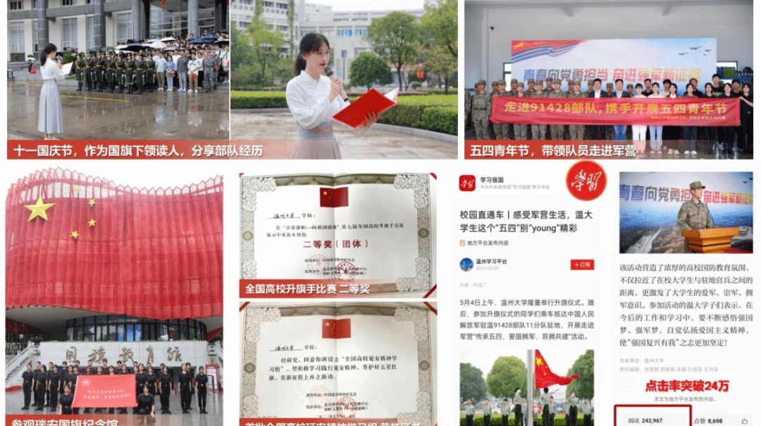 五四青年节,谢宛含带领队员走进军营,拉近了在校大学生与驻地官兵之间的距离,此次活动入围了温大2023校园好新闻,并在学习强国报道中突破24万点击量。十一国庆节,作为国旗下领读人,谢宛含分享部队经历,表达对祖国母亲的真挚祝福,再次获得了学习强国、教育之江、漫画柜 、温大青年、温大学工等媒体报道。
